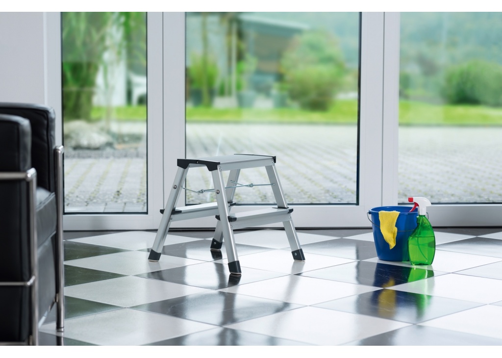 Hailo D60 StandardLine - Der kleine Aluminium- Klapptritt für schnelle Fälle Egal, ob Sie gerade Ihr Lieblingsbuch auf dem obersten Regal suchen oder Gläser in einer hohen Vitrine abstellen wollen – wenn Sie mal schnell was zum Hochsteigen brauchen, dann ist dieser kleine Klapptritt mit der großen Standfläche immer griffbereit. Dabei verhindert die Sperrmechanik, dass er ungewollt auseinander- oder zusammenklappt. Der Klapptritt zum Steigen und Sitzen ist besonders praktisch und komfortabel im Haushalt. Wenn Sie fertig sind, lassen Sie ihn einfach wieder unterm Tisch oder in der Ecke verschwinden. Bis zum nächsten Mal. Eine echte Hilfe im Haushalt!