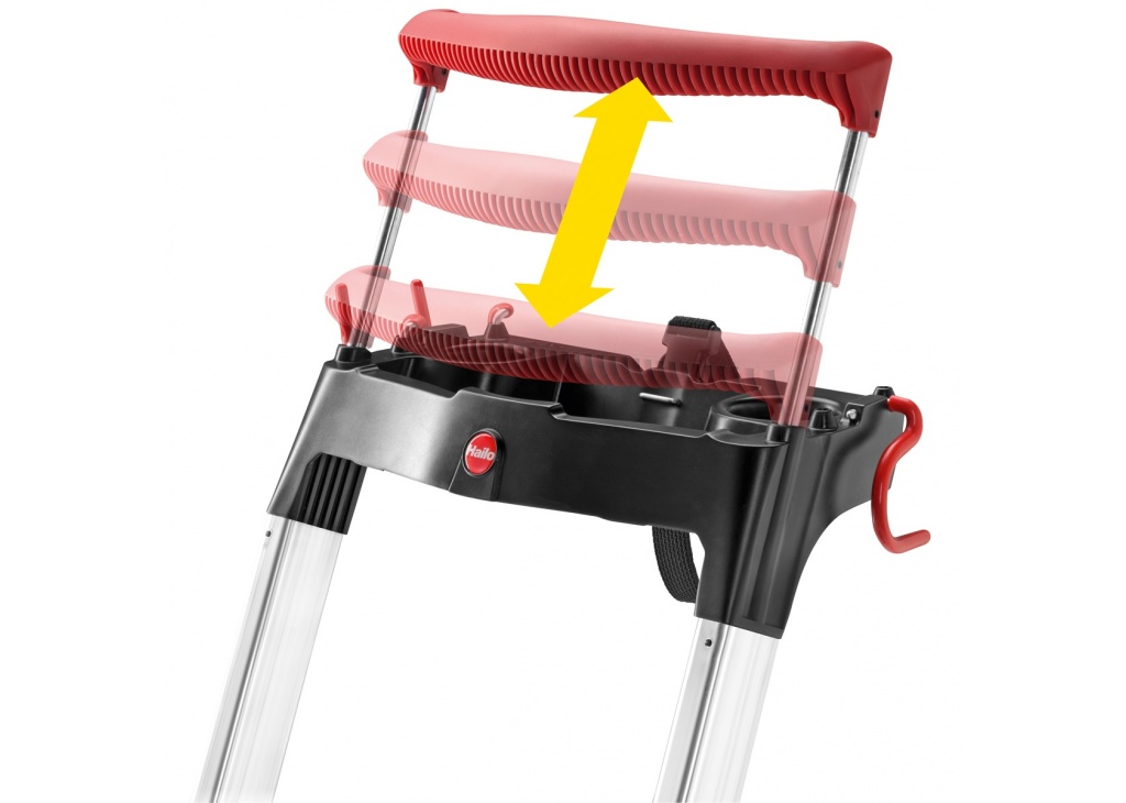 Die Alu-Sicherheits-Stehleiter mit Multifunktions- Schale, Sicherheits-Haltebügel und Plattformverriegelung bietet Sicherheit im XXL Format: 130 mm extra tiefe Stufen. Geeignet für Hailo EasyClix Wechselfüße (optionales Zubehör) Plattformverriegelung für sicheres Ver- und Entriegeln Schwarze XXL-Alu-Stufen mit Anti-Rutsch- Riffelung und extra tiefer Standfläche Verzinkte, schwarze Stahl-Plattform mit Anti- Rutsch-Riffelung Ausziehbarer Sicherheits-Haltebügel zum Festhalten beim Arbeiten auf der Plattform Multifunktions-Ablageschale zur Ablage von Werkzeugen, Farbdosen oder Kleinteilen Eimerschlaufe mit Klick-Schnellverschluss zur sicheren Befestigung von Eimern, Staubsaugern oder Kabeltrommeln 2 Universalhaken als Halterung für Heckenscheren, Putzmittel oder Malerrollen 1 Stabhalter als Halterung für Besen oder Pflücker Sichere, HighTech-vernietete Holm-Stufenverbindung Stufe zusätzlich mit Eckaussteifungen versehen Rutschsicherer Steckfuß Belastbar bis 150 kg